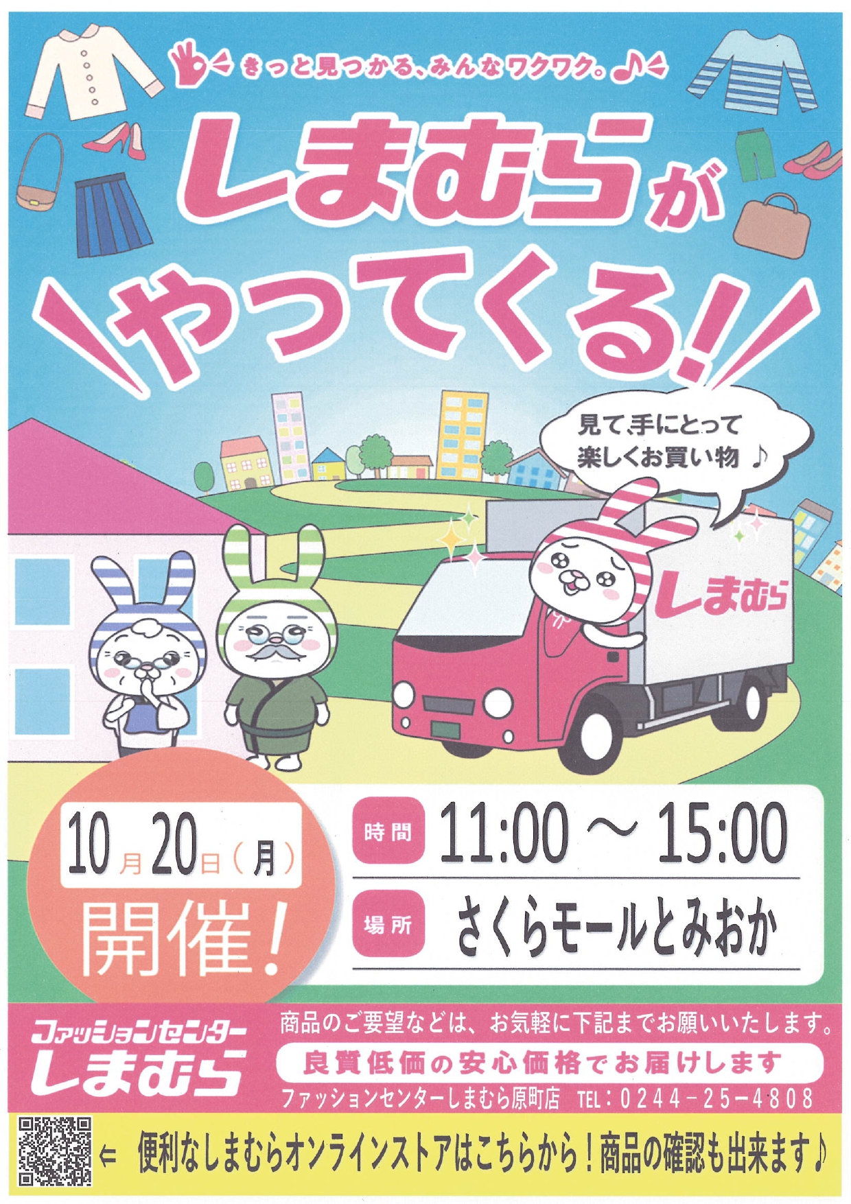 しまむらがやってくるイベント 2025.10.09さくらモールとみおかにて「しまむら出張販売」が開催されます。多数の衣料品が販売されますので、ぜひ足をお運び下さい。日程:10月20日(月)時間:11:00~15:00場所:さくらモールとみおか