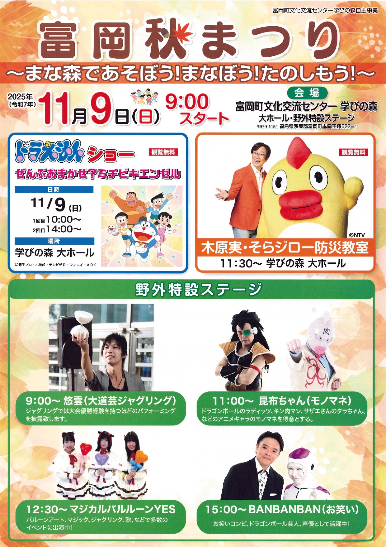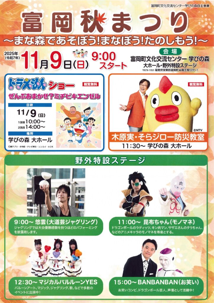 また、まな森であそぼう!では、ドラえもんショーや木原実・そらジロー防災教室・野外特設」ステージも開催されます。
