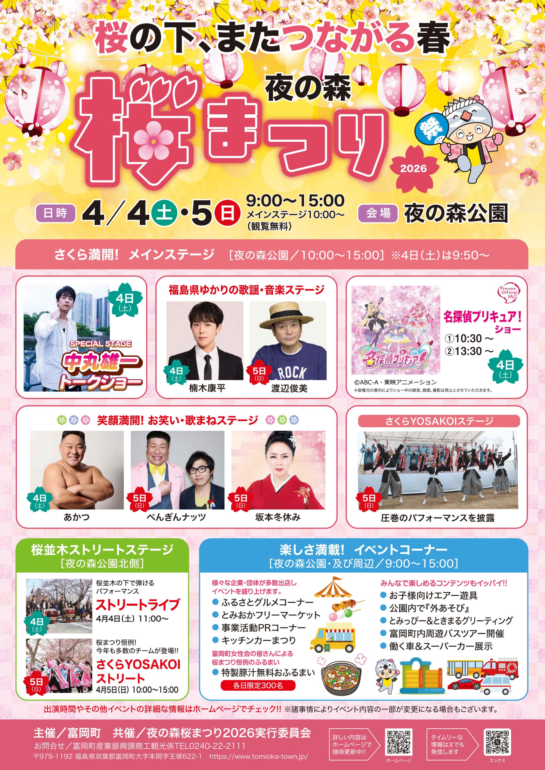 メイン会場の夜の森公園では桜満開ステージショーや出店ブースコーナー、夜の森公園北側では、よさこいショーやストリートライブ等が行われます。