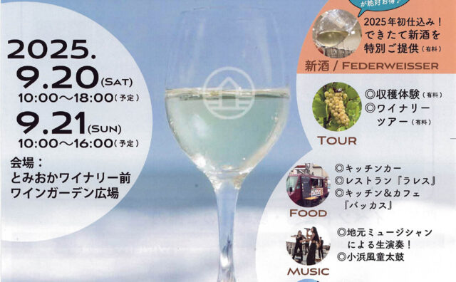 イベントとみおかワイナリー収穫祭 とみおかワイナリーではじめての収穫祭が開催されます。これまでの出会いやご協力、またこの機会に出会える皆様に感謝する2日... 2025.09.09 2025.09.10イベント