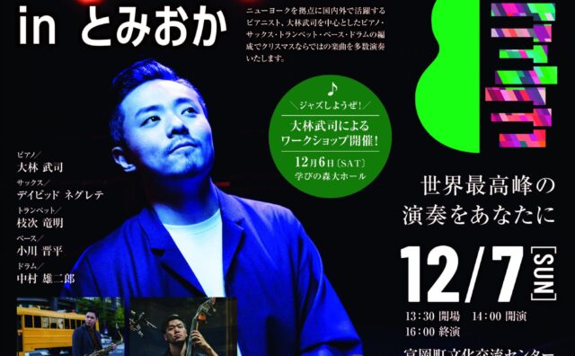 イベント大林 武司クリスマスジャズコンサートinとみおか 『大林 武司クリスマスジャズコンサートinとみおか』が開催されます。ニューヨークを拠点に世界規模で活躍するピアニスト、... 2025.11.18イベント